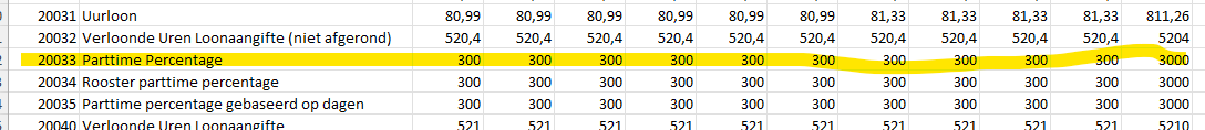 Ga naar de regel met looncomponent 20033 Parttime percentage: