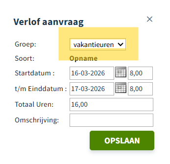 Standaard zie je dan bij Groep "vakantieuren". Het kan zijn dat er bij jouw bedrijf meerdere verlofsoorten zijn, zoals bijvoorbeeld tijd-voor-tijd. Wil je een ander soort verlof aanvragen, dan kan je op "vakantieuren" klikken en de andere verlofsoort selecteren.
