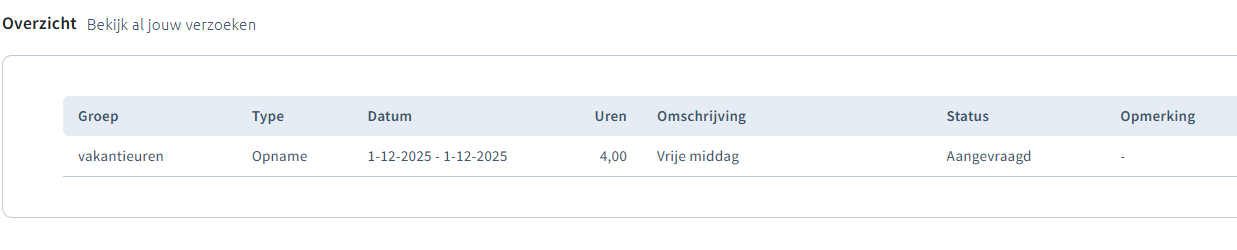 Bij de omschrijving kan je korte toeliching geven. Als je een halve dag vrij wilt nemen, is het handig om aan te geven of je dan bijvoorbeeld de ochtend of de middag vrij wilt hebben.
