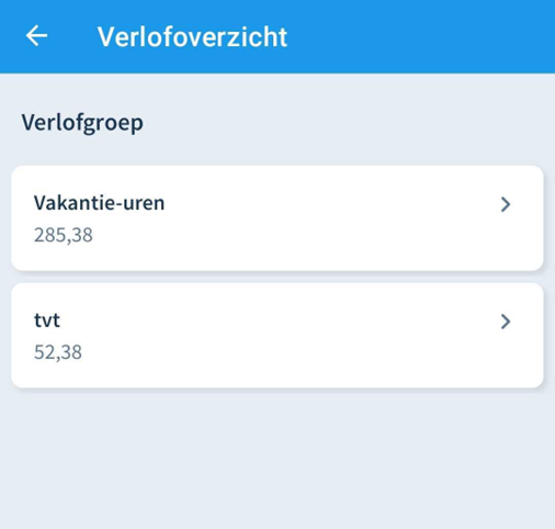 Afhankelijk van de verlofinstellingen van de werkgever zie je hier een of meerdere verlofgroepen. Elke verlofgroep geeft het huidige saldo (resterende) saldo.